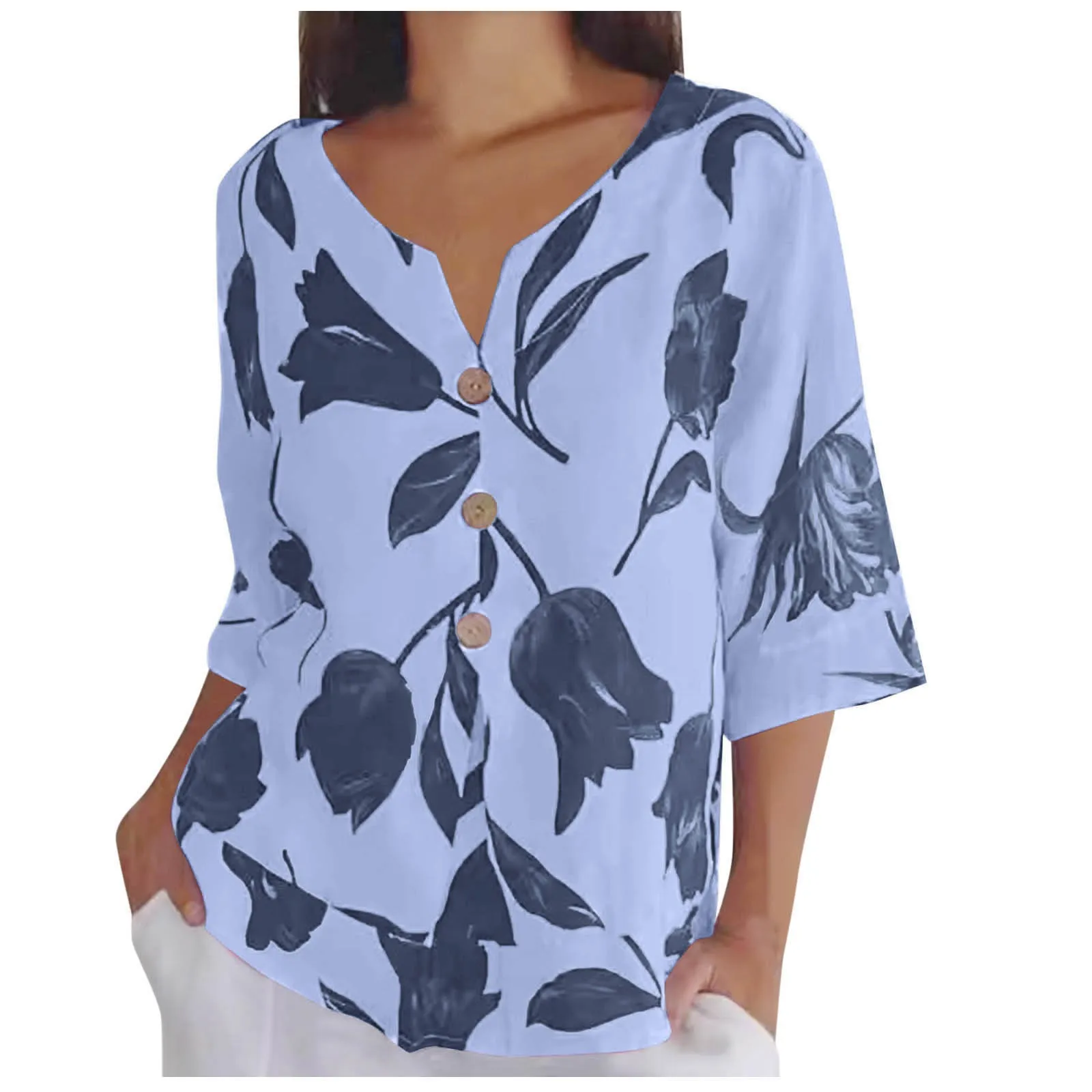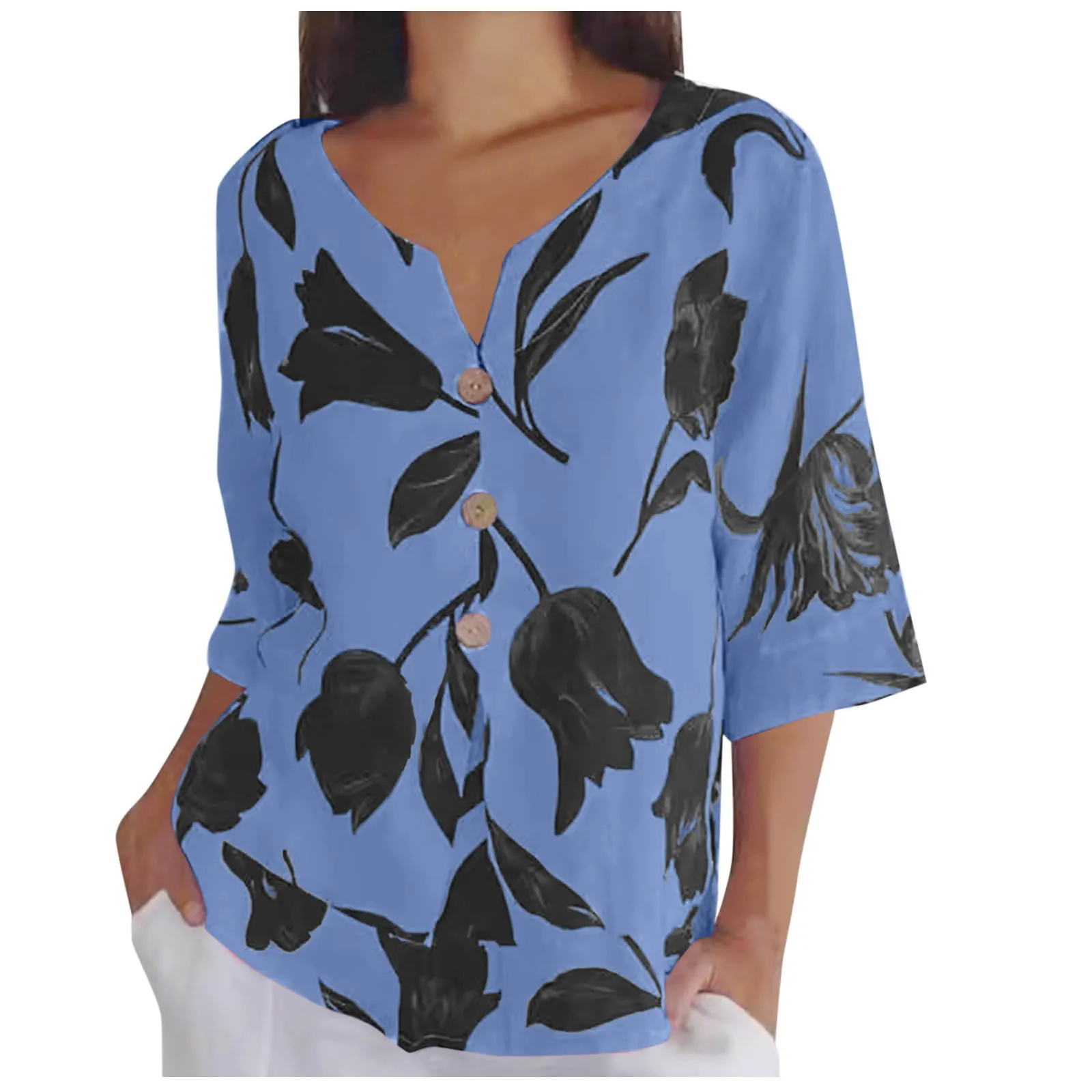 Women's Summer Tops Cotton Linen Basic Tops Versatile Pullover Elegant 3/4 Sleeve Plain Short Sleeve Tops Casual Retro T Shirt With Three Quarter Sleeve Blouse Tops Teenager Girls